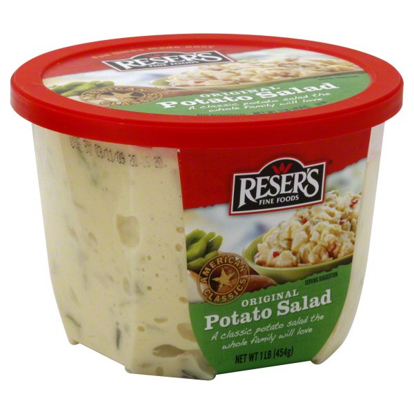 Resers Potato Salad Amish An Amish-style potato salad for fun times with friends familyResers Fine FoodsFamily owned and operated for more than 60 years Resers remains committed to making wholesome food using quality ingredients and time-tested recipes you can trust UPC Code 071117190458 Manufactured by Resers Fine Foods Inc. Show full nutrition information Resers. Resers Potato Salad Original has 1600 calories.